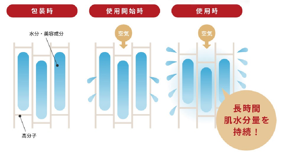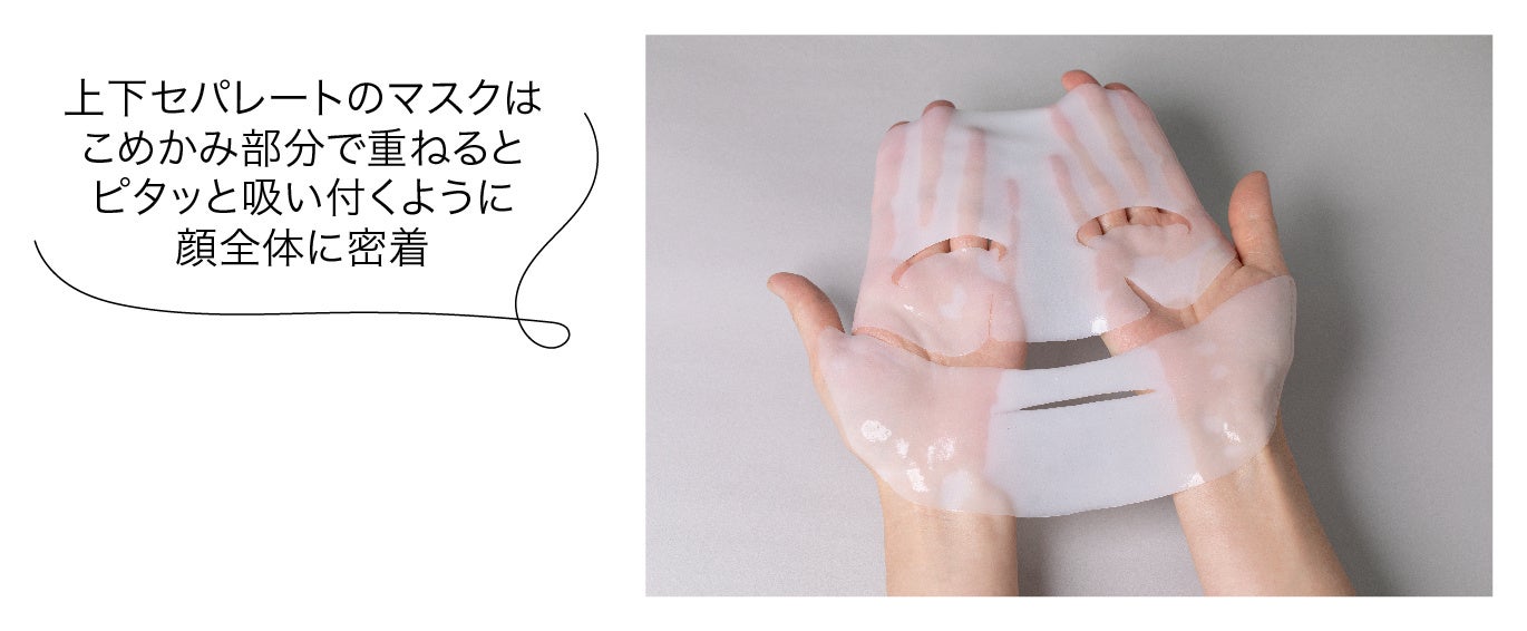 立体的な高分子ポリマーのゲルマスク素材を採用。肌にのせると微振動を起こして、10分間美容成分をBleed=じわじわ肌へ浸透※5。はがしてから1時間後もしっとり、高い保湿力をご体感いただけます。