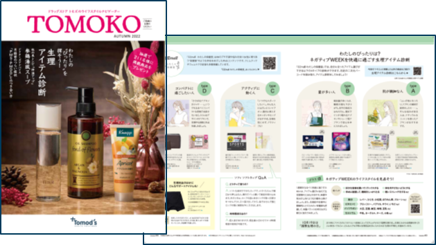 トモズファンに向けて年4回発行されているフリーペーパー「TOMOKO」。9/4(日)発行の「TOMOKO」秋号では本企画と連動した「生理」に関する特集を展開します。店頭で体験できる生理アイテム診断の誌面バージョンや診断を監修した婦人科医のインタビューを掲載。トモズ全店の店頭で配布され、コラボレーション棚の設置がない店舗を利用する方にも最新の生理アイテム情報を広げていきます。