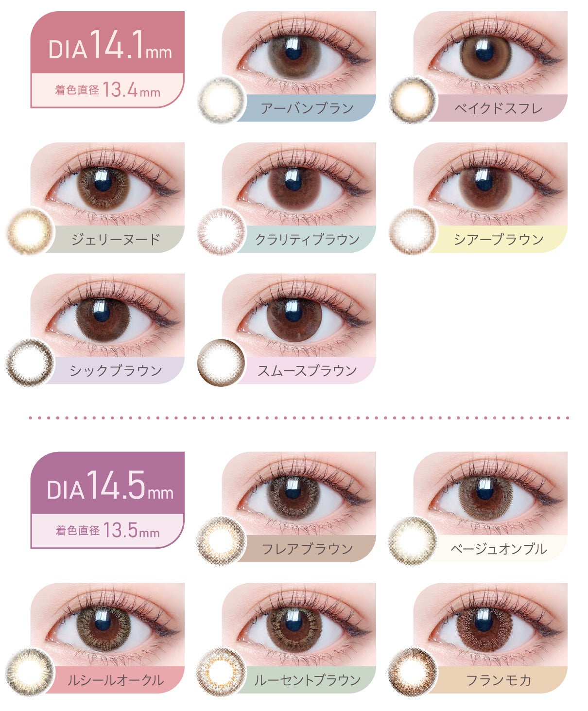裸眼のようにさりげない【DIA14.1mm】から存在感のある【DIA14.5mm】まで、レンズ直径・カラーが異なる12色展開でなりたい仕上がりに合わせてお選びいただけます。