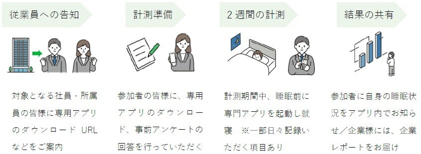 • 参加企業・団体の社員・所属員の皆様には、専用アプリをインストールしたスマートフォンを枕元に置いて自分の睡眠を運動日程のうち任意の2週間計測いただきます。