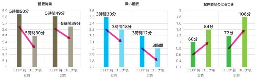 コロナ前後のデータを比較すると、睡眠時間や質(深い睡眠を取れている時間)は減少傾向、起床時間のばらつきは拡大傾向にあることがわかりました。やはり、コロナによる生活や働き方の変化は、私たちの睡眠にも何らかの影響を及ぼしているのかもしれません。