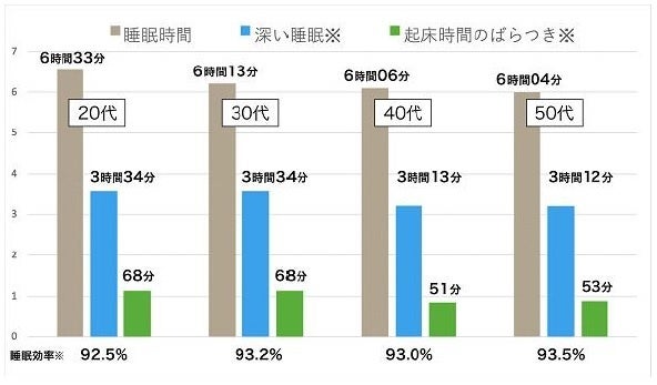 テスト運用では、年代別の睡眠状態に、大きな差は見られなかったものの、睡眠時間に限って見てみると、上の世代ほど短くなっており、若い世代の睡眠時間が長い傾向がみられました。