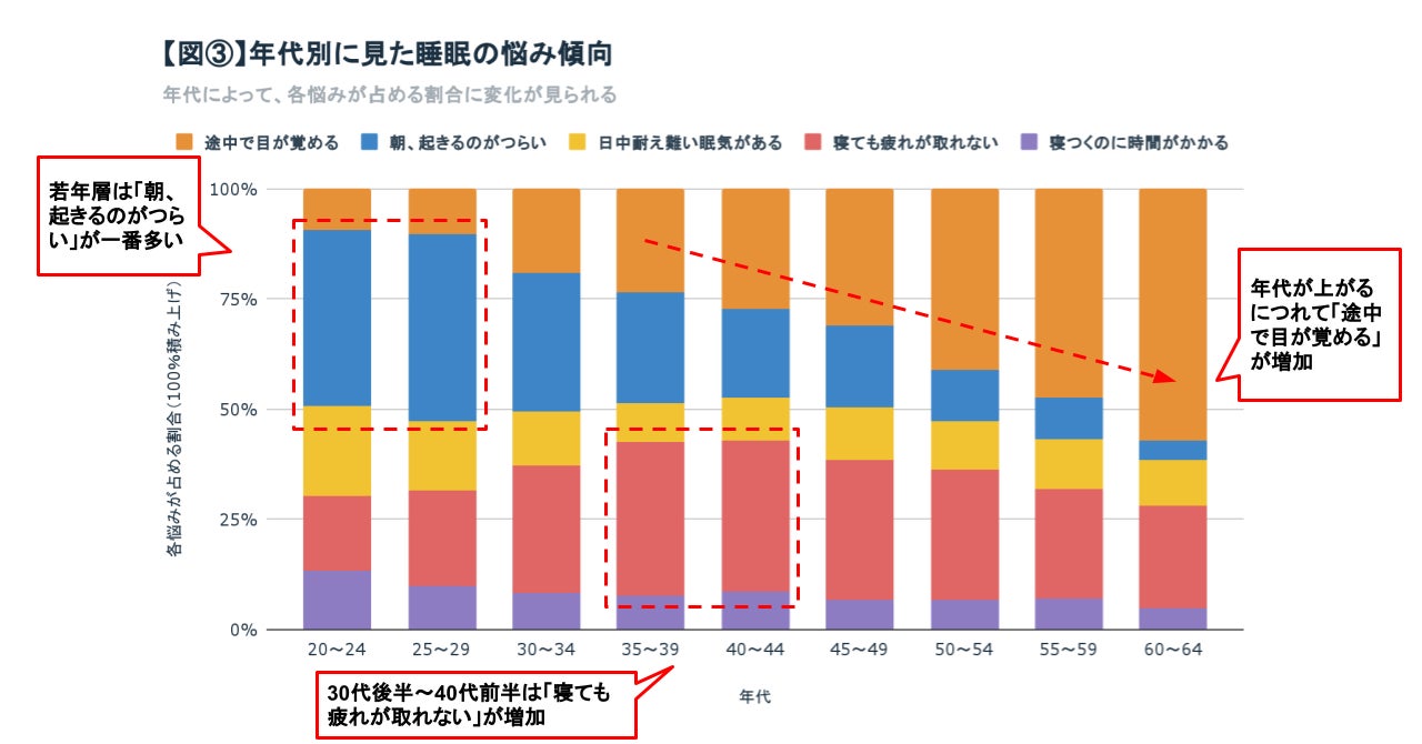 20代で40%を占める悩みは「朝起きるのがつらい」ですが、年代が上がるにつれて悩みの割合は減少しています。一方で、20代では10%程度である悩み「途中で目が覚める」は、年代が上がるにつれて増加し、50代では一番多くを占める悩みとなっています。そして30代から40代にかけては「寝ても疲れが取れない」悩みが増え、35~44歳では一番多くを占める悩みとなっています。【図③】