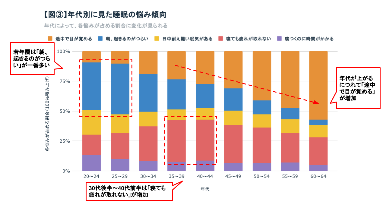 20代で40%を占める悩みは「朝起きるのがつらい」ですが、年代が上がるにつれて悩みの割合は減少しています。一方で、20代では10%程度である悩み「途中で目が覚める」は、年代が上がるにつれて増加し、50代では一番多くを占める悩みとなっています。そして30代から40代にかけては「寝ても疲れが取れない」悩みが増え、35~44歳では一番多くを占める悩みとなっています。【図③】