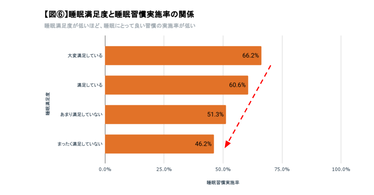 (1)睡眠満足度が低い人は、良い眠りのために必要な生活習慣の実施率が満足度に比例して低い。特に寝る前の心身のリラックス状態は、睡眠満足度が高い人と比べて67.8%低下