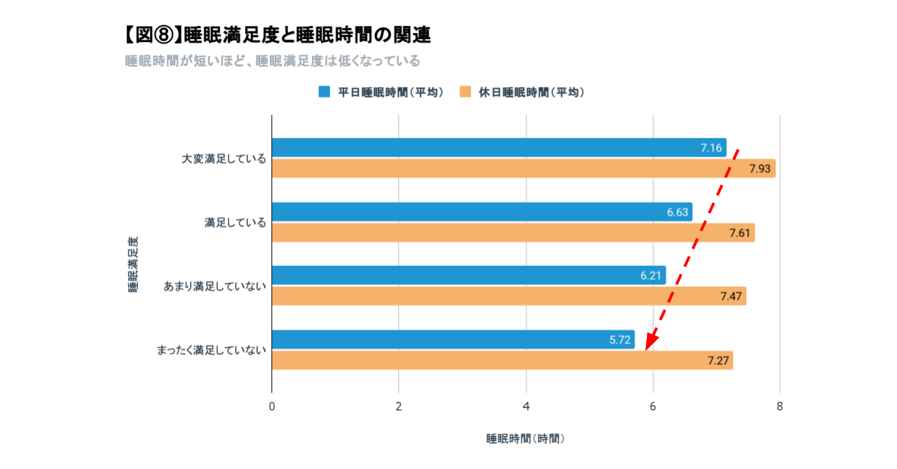 睡眠満足度が低いほど、睡眠時間が短くなる傾向が見られました。まったく満足していないと回答した人の平均睡眠時間(平日)は5.72時間であり、睡眠に満足していると回答した人の平均睡眠時間(平日)と比べて0.9時間短くなっています。【図⑧】