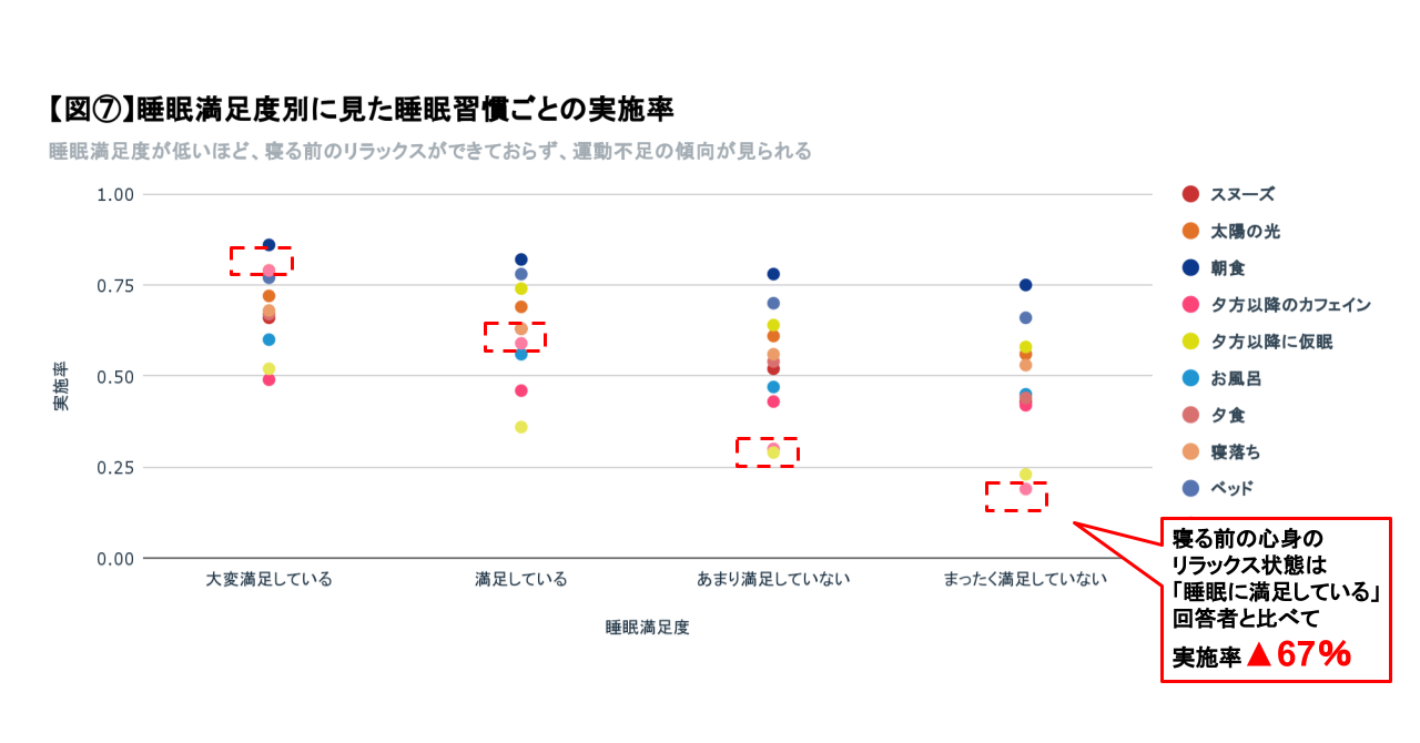 睡眠満足度が低いほど、良い眠りのために必要な生活習慣(睡眠習慣)の実施率(*4)が低くなっています。【図⑥】特に、寝る前のリラックス状態は、まったく満足していないと回答した人の実施率は、睡眠に満足していると回答した人と比べて67.8%下がっており、寝る前のオンオフ切り替えに大きく課題があることがわかります。【図⑦】