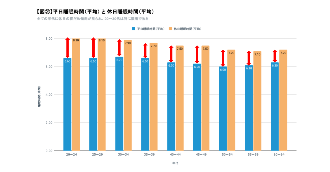 全ての年代で睡眠に満足していない割合(*1)は、60%前後を占めています。全体平均の不満足度は65%であることに対し、20~24歳の若手社員であっても不満度は61%であり、社会人経験の長短は関係なく課題を感じていることが伺えます。【図①】また、全ての年代で平日と休日の睡眠時間に1時間前後の差が見られ、特に20代は1.5時間の差となりました。【図②】