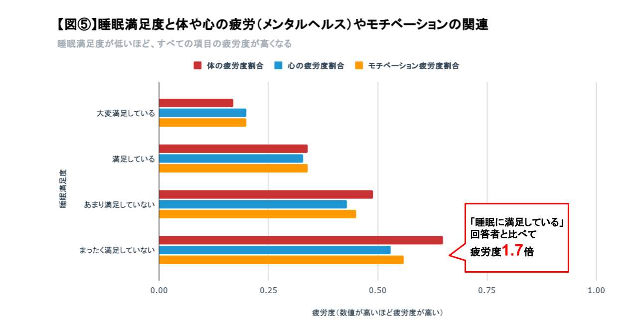 また、睡眠満足度が低くなるほど、体の疲労度が高くなり、心の余裕度合いが減り、日々のモチベーションが下がる傾向が見られます。まったく満足していないと回答した人は、睡眠に満足していると回答した人と比べて、疲労度(*3)が1.7倍になっています。【図⑤】