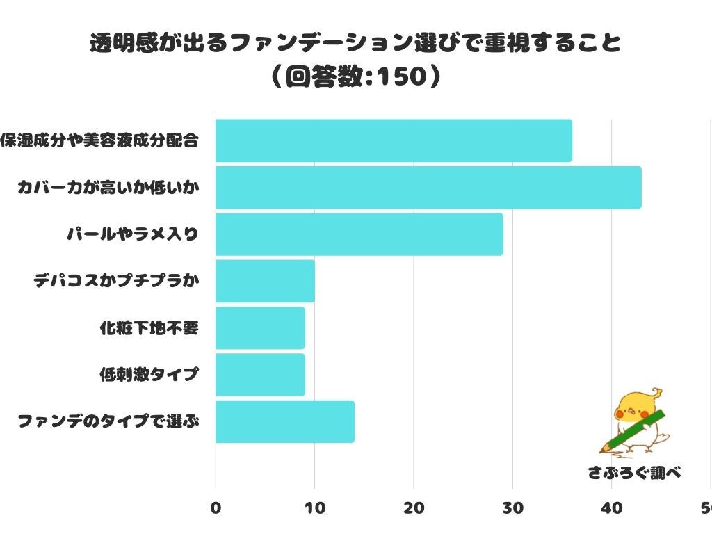 透明感が出るファンデーション選びで重視することをアンケートにて調査したところ、1位は「カバー力が高いか低いか」でした。