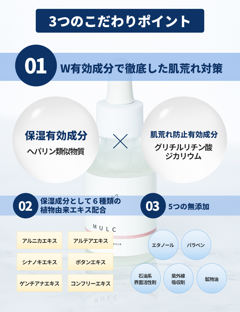 保湿有効成分・ヘパリン類似物質と肌荒れ防止有効成分・グリチルリチン酸ジカリウムをダブルで配合した、乾燥・肌荒れ防止美容液。お顔の乾燥、肌荒れを徹底ケアしたい方におすすめです。