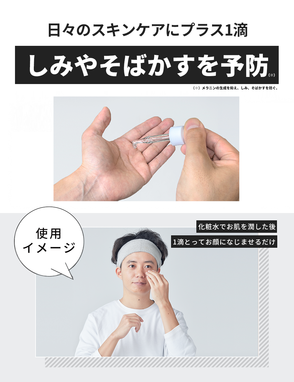 化粧水でお肌を潤した後、美容液を1滴お顔になじませるだけ。日々のスキンケアルーティンにプラスして使うことで、肌悩みに合わせたケアをしていただけます。
