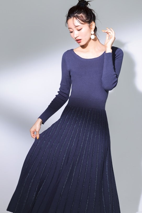 位置が高めのウエスト切り替えと、編地の変化でボディラインを美しくメイクしてくれるニットワンピース。スカート部分のさりげないラメラインで上品な華やかさをプラス。