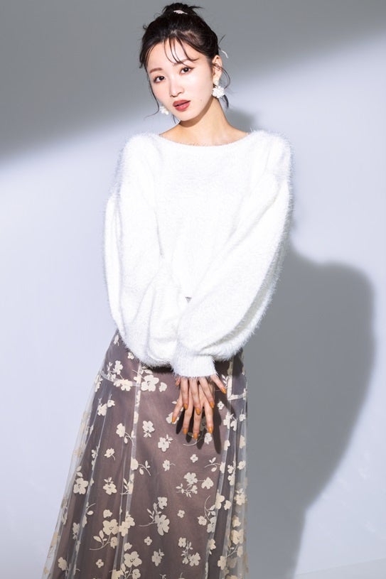 チュールに刺繡をあしらったフレアスカート。身に纏うだけでやわらかい雰囲気を演出できるシャギー素材のニットでフェミニンな着こなしに。