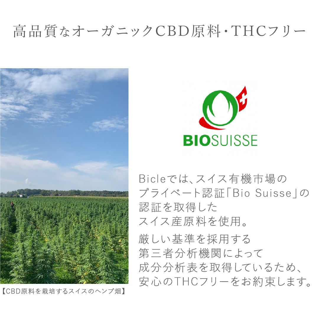 Bicleでは、安全で高品質なCBDを届けるために、世界150社以上のCBDメーカーの中から、厳選したCBD原料を独自に調達。日本では問題となるTHCが含まれないよう、市場に流通している中でも特に厳しい検査基準を設けることで、厳格に管理しています。