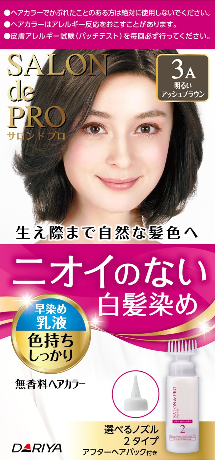 浸透クリーム・乳液が生え際までしっかり染め上げ、独自の染料処方と色持ち成分により、自然な髪色が続きます。また、4つの自然由来トリートメント成分配合で髪にもやさしい使い心地なのが特長です。そして今秋、注目のアッシュ系ニュアンスが楽しめる新色、「3A<明るいアッシュブラウン>」が登場します。