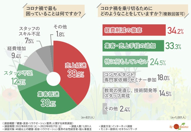 売上や集客低迷に困っており、対策として経費削減や集客・売上手段を追加している方がいる一方で、特に何もしていない方も少なくないようです。