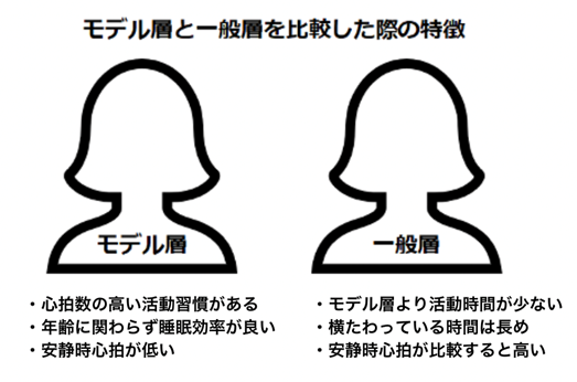 ・モデル層は圧倒的に運動習慣があり、一般層より着座平均時間が23.6分短く、心拍数の高い活動時間が各項目とも多く、安静時心拍数は低かった。また睡眠は就寝時間が増えると相関して深い睡眠が増え、睡眠効率が良いことが伺えたが対して一般層は睡眠時間が増えても効率的には悪かった。