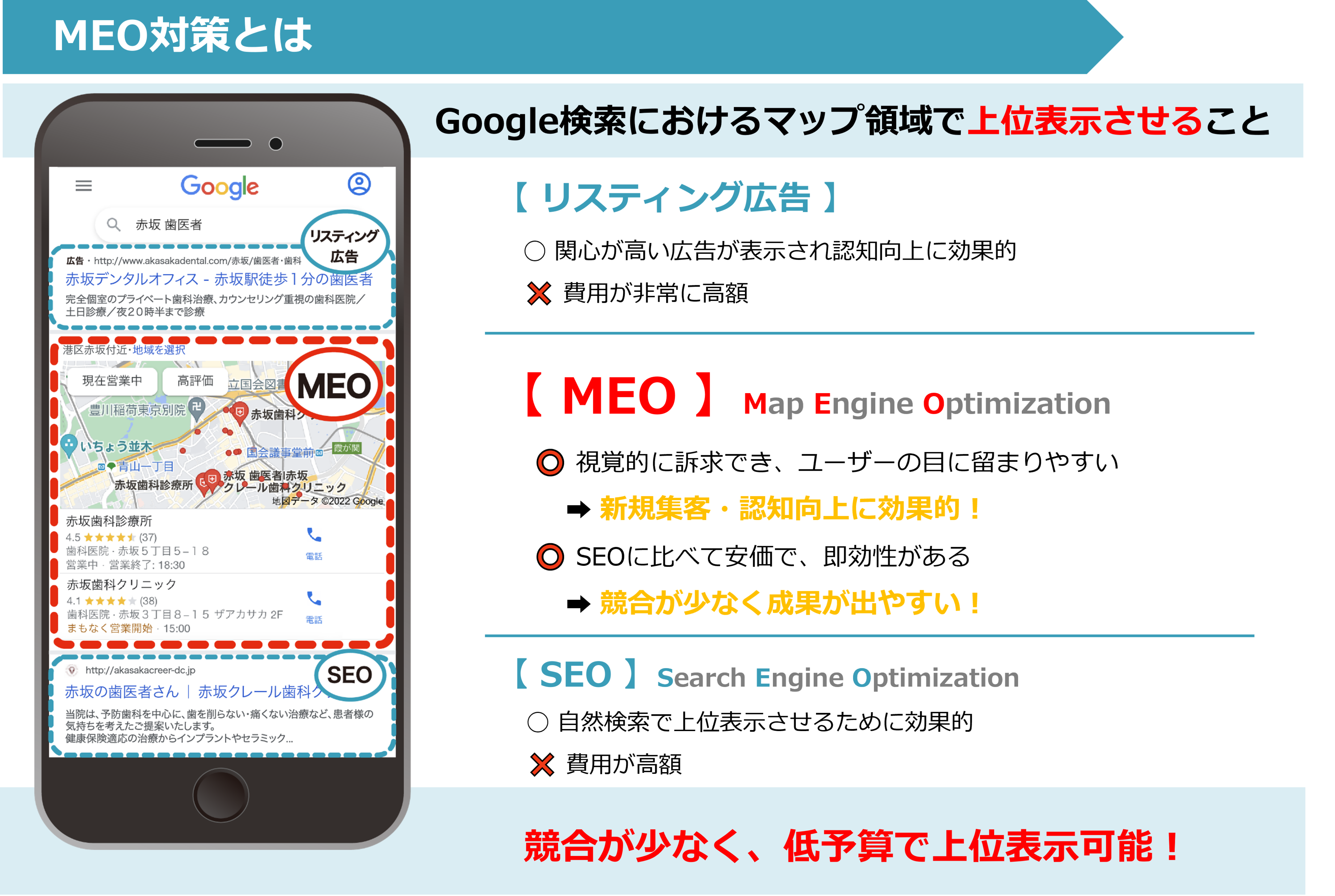 MEOとは、Map Engine Optimization(マップ検索エンジン最適化)の略で、Google検索におけるマップ領域(=Googleマップ)で上位表示させるための施策のことです。