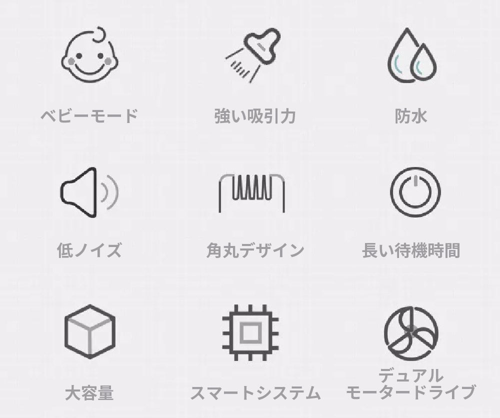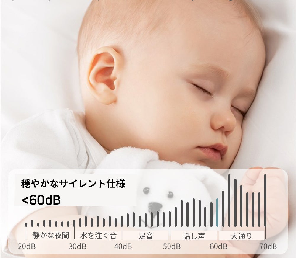 さらに、ご自宅で赤ちゃんに使う際に音が大きすぎず、低ノイズの60dB以下で動作します。