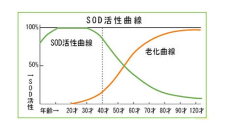 私たちの体の中には、不要な活性酸素を分解してくれる働きをもつ「SOD酵素」が存在していますが、SOD酵素は、40代頃から急激に低下していきます。