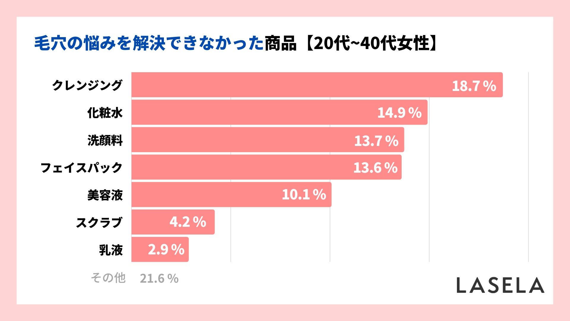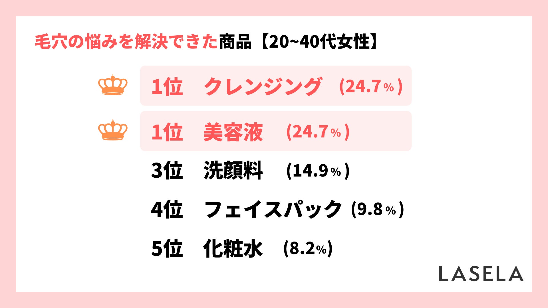- 毛穴の悩みを解決できたアイテムは「クレンジング」と「美容液」が24.7%で最多