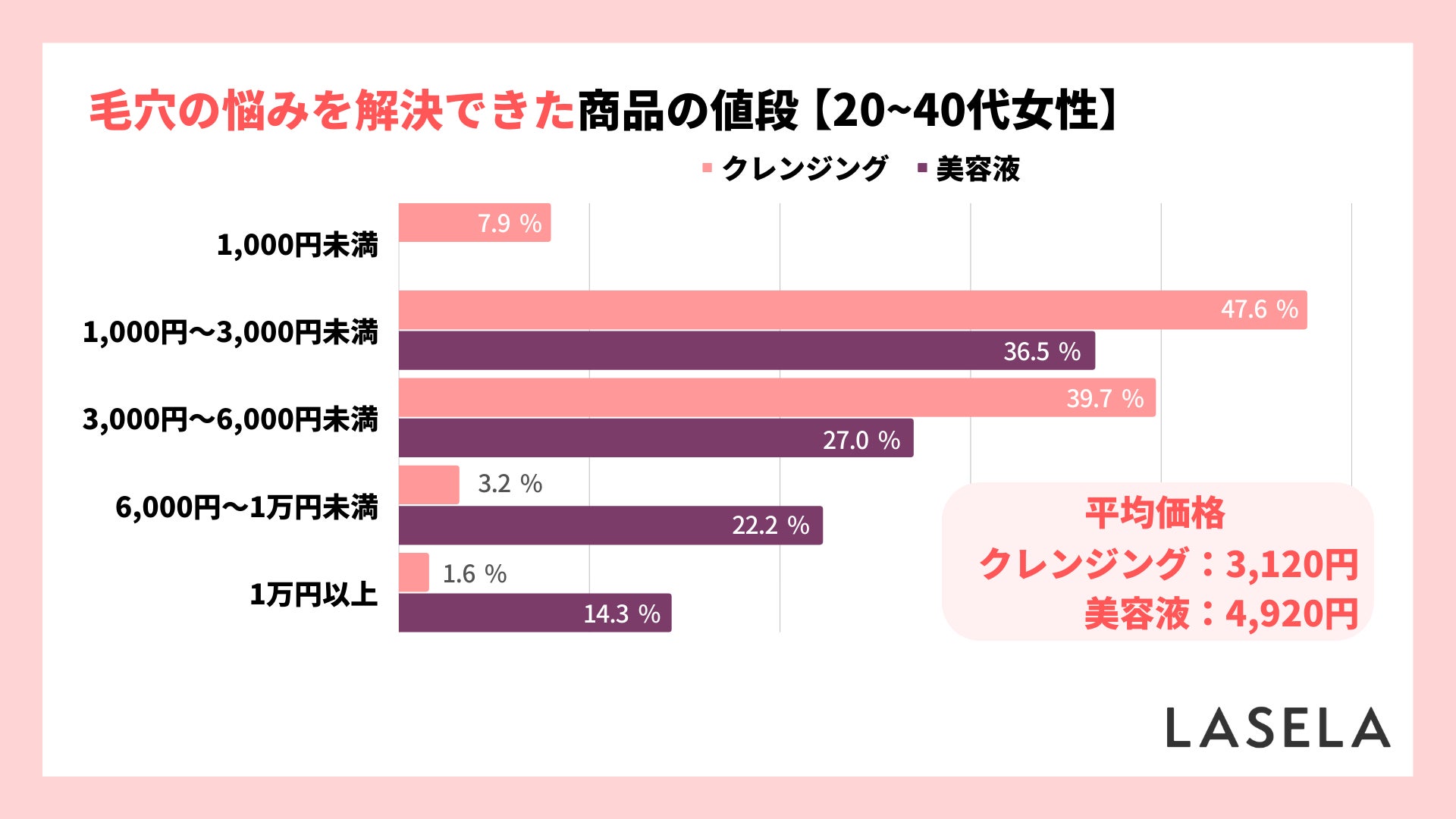 毛穴の悩みを解決できた人が使っている美容アイテムの商品価格をたずねると、「クレンジング」の平均価格は3,120円、「美容液」は4,920円で、1,800円の差がありました。
