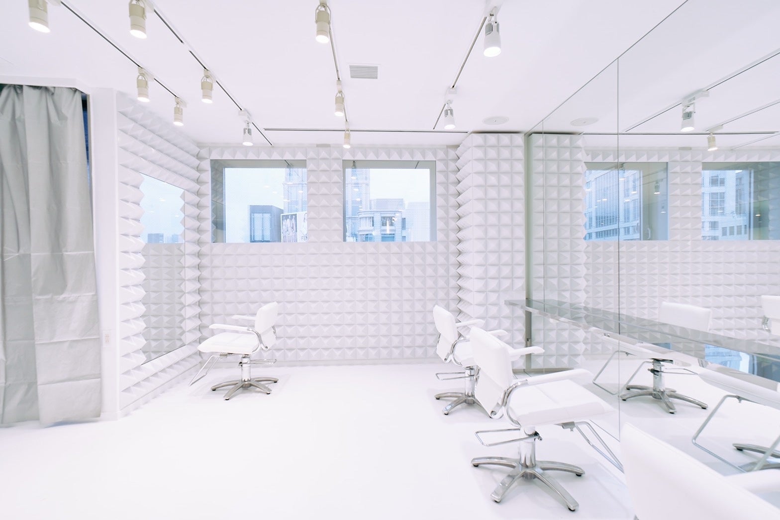 突然の出会いでしたが、熱意と感性のデリケートさを皆さんから感じたので、作品の制作を受けさせていただきました。人間は、自然を作れませんが、人間が最も宇宙とつながるフォルムが、ピラミッドであり、その1236個の空間がつくるエネルギーにより、新しい創造性が、poppinsから生まれていくということを考え、ショップのデザインをさせていただきました。乱反射するピラミッドによる光陰と洗練されたミラーによるコントラスト空間、コンテンポラリーアートの中で、ヘアの造形を楽しんでいただく空間になればと思います。日本及び東京が、ヘアの界でも、その芸術性が世界のトップであることを表現していただきたいと思います。