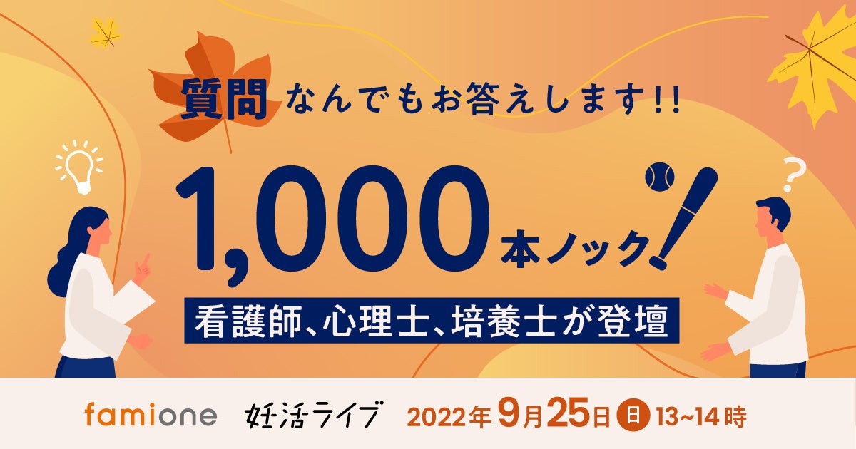 「子どもを願うすべての人によりそい 幸せな人生を歩める社会をつくる」をビジョンに掲げ、LINEを活用した妊活コンシェルジュサービス「famione(ファミワン)」 https://lp.famione.com/ を提供する株式会社ファミワン(本社:東京都渋谷区、代表取締役:石川勇介)は、「妊活ライブ」上にて、9月25日(日)に妊活ライブの人気企画「質問1000本ノック!」と題したオンラインセミナー(https://famione.com/live/before/220925/)を実施します。「妊活ライブ」会員サービスでは、月額500円で毎月セミナーの参加と100本以上のアーカイブ動画の視聴がご利用いただけます。