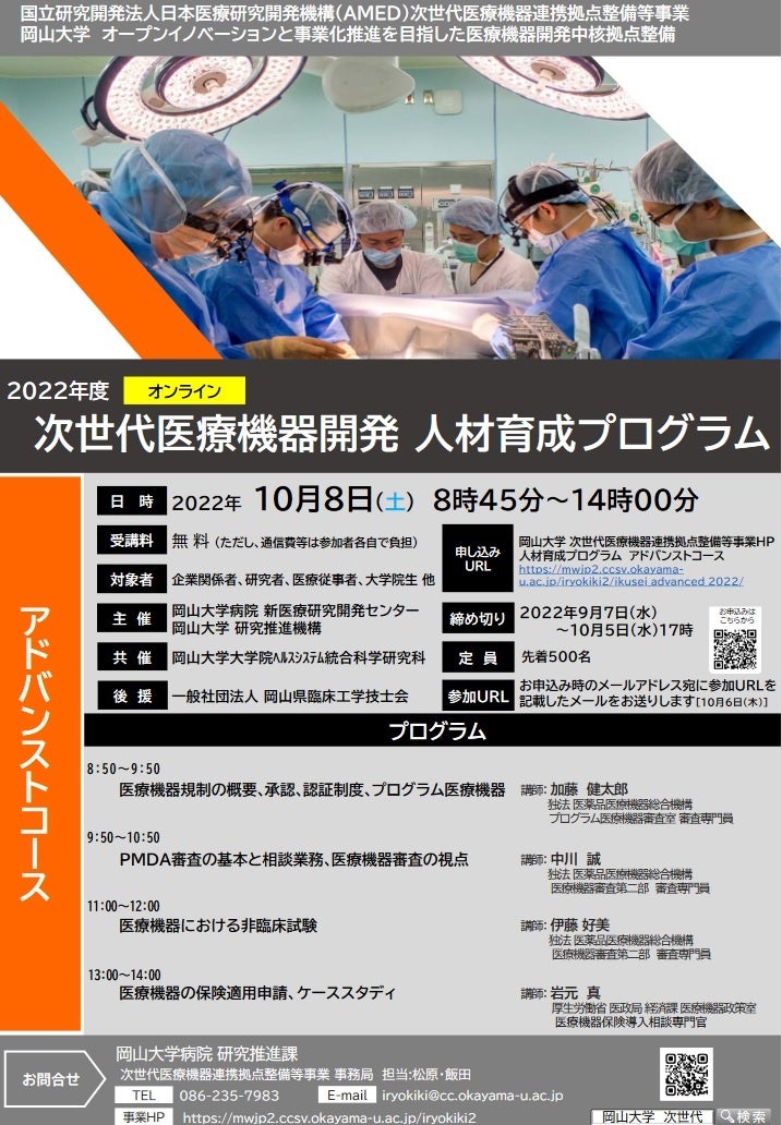 国立大学法人岡山大学(本部:岡山市北区、学長:槇野博史)の岡山大学病院では、医療機器開発等に関心のある方を対象とした参加費無料の人材育成プログラム「2022年度次世代医療機器開発人材育成プログラム アドバンストコース」を、2022年10月8日(土)にオンラインで開催いたします。