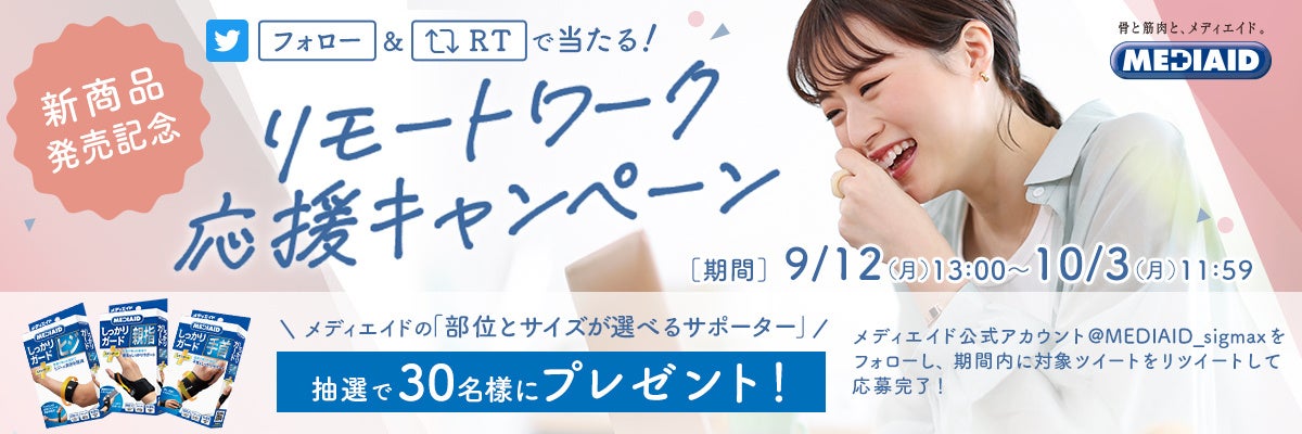 リモートワークをはじめとする日常の様々なシーンでのカラダ、姿勢への負担をサポートし応援するキャンペーンとして、抽選で30名様にメディエイドサポーター8種類の中からお好きな製品・サイズをプレゼントいたします。