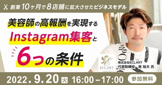 国内最大級の顧客満足度向上プラットフォーム「ファンくる」を運営する株式会ROI(本社:東京都千代田区、代表取締役社長:山口敬人)は株式会社ECLART (エルクラート)(本社:埼玉県さいたま市、代表取締役:南裕大)の南代表をお迎えし、「創業10ヶ月で8店舗に拡大させたビジネスモデル〜美容師の高報酬を実現するInstagram集客と6つの条件〜」 (定員:100名/無料)を9月20日(火)に開催いたします。(申し込み先:https://biz.fancrew.jp/seminar_contact?=pr1)