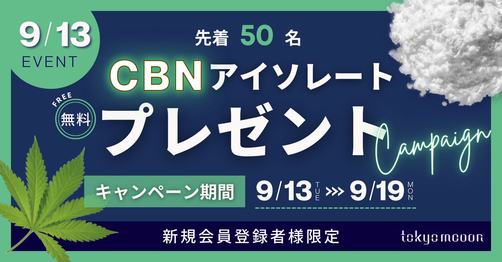 今回「tokyo mooon」では9月13日から、7日間限定のCBNアイソレート原料プレゼントキャンペーンを開催します。オイル、ベイプ、グミ、ドリンクなどのCBDブランド立ち上げを行う事業者が増える中、レアカンナビノイドであり、CBDとは異なる効果効能のあるCBNアイソレートにも注目が集まっております。