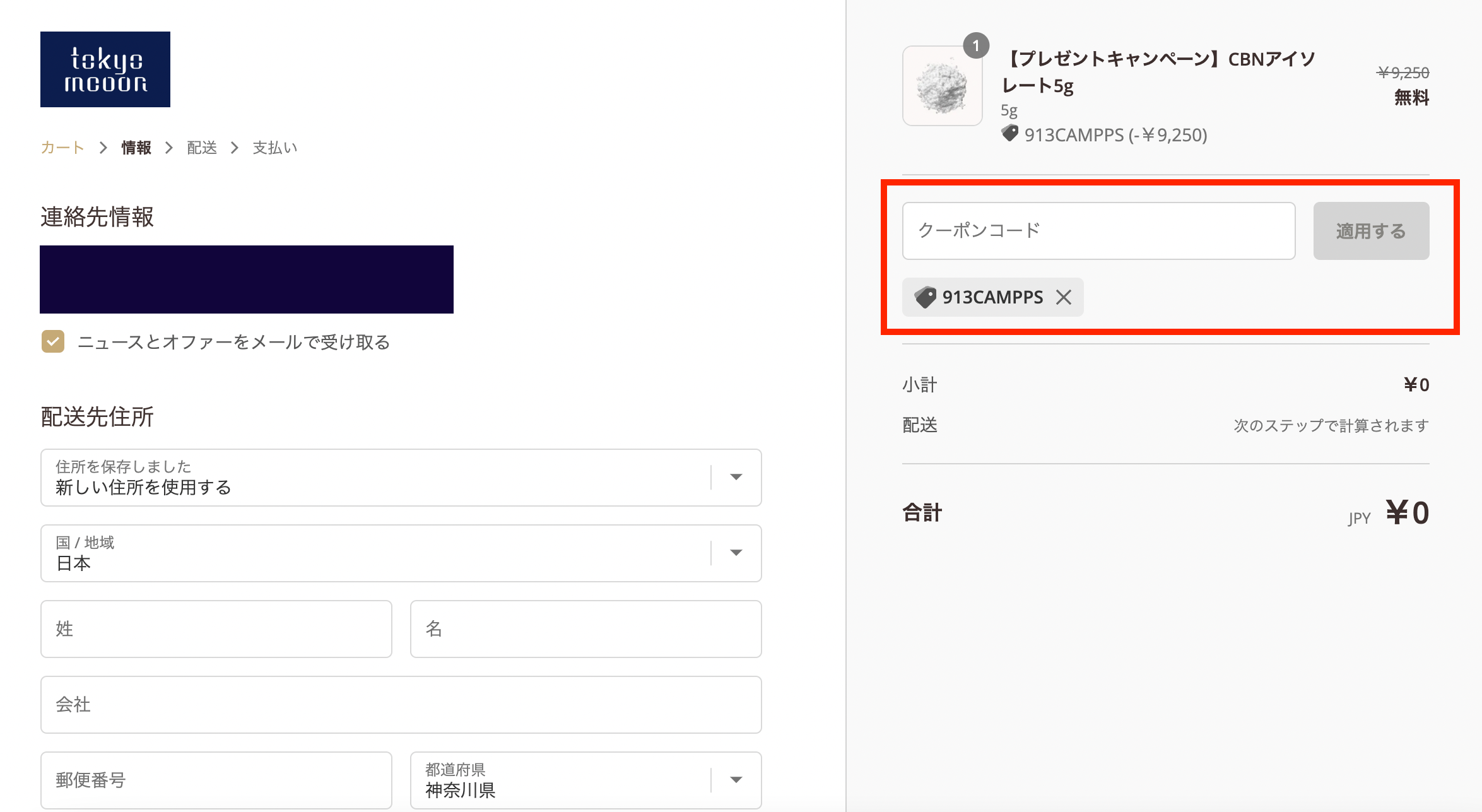 3. 購入画面で上のようにクーポンコード「913campPS」を入力し、「適用する」を押します