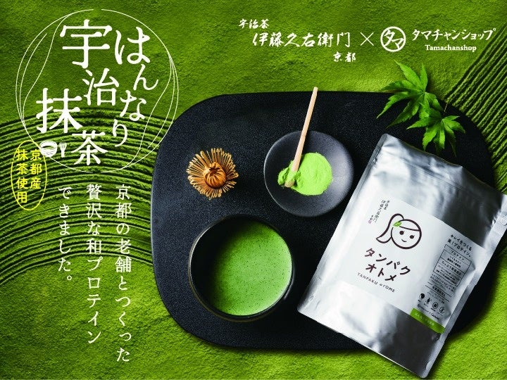 本商品は、創業190年の京都宇治の老舗茶屋「伊藤久右衛門」(本社:京都府宇治市、代表取締役:北村 公司)とコラボレーションし、京都産原料100%の宇治抹茶を使用。タンパクオトメの栄養に、世界でも大人気の日本の誇れる抹茶の栄養も加わった唯一無二の贅沢な抹茶プロテインができました。