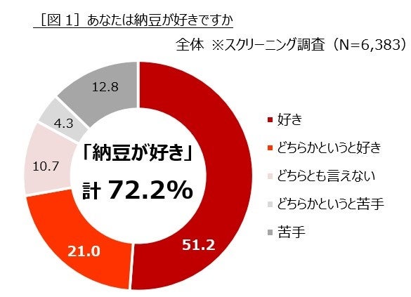 納豆全般についての好き嫌いを聞いたところ、「好き」(51.2%)、「どちらかというと好き」(21.0%)を合わせて72.2%と7割以上の人が「納豆好き」であることが判明しました[図1]。