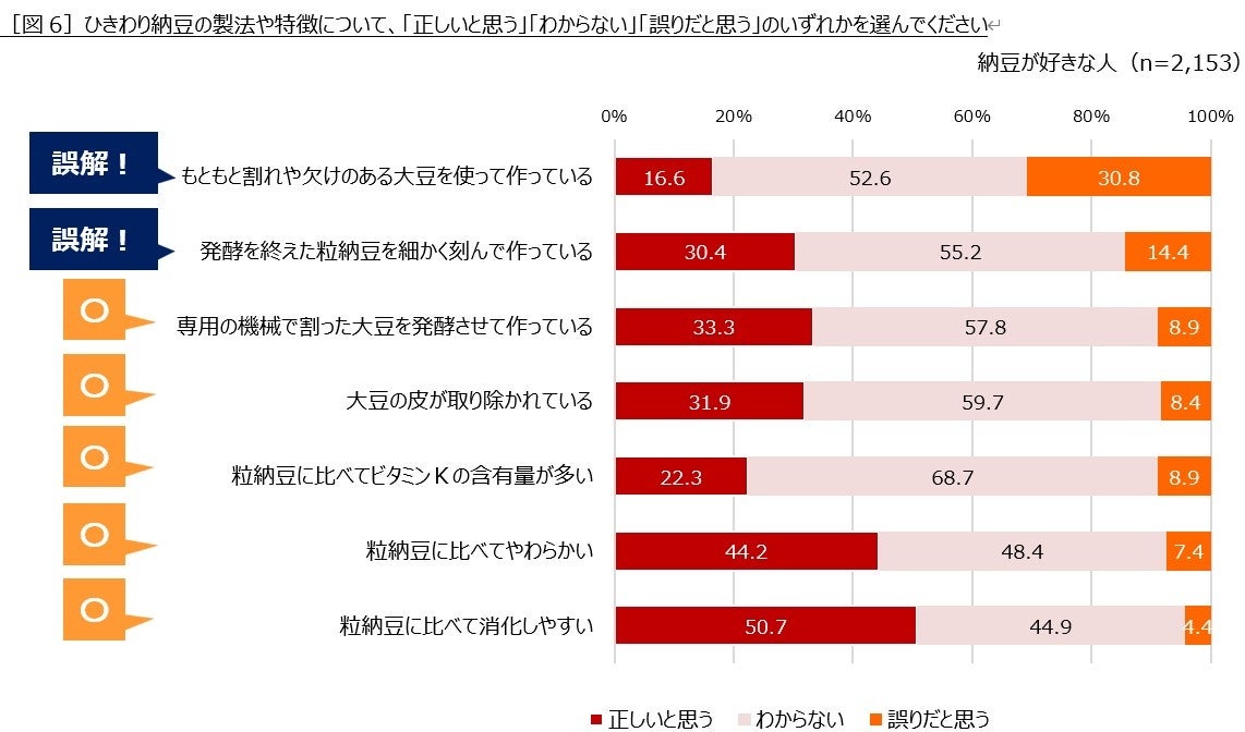 「納豆好き」の人でも、「ひきわり納豆」は「発酵を終えた粒納豆を細かく刻んで作っている」と誤解している人が30.4%おり、「ひきわり納豆は大豆をひきわってから発酵」していることを知っていた人は14.4%にとどまる。「粒納豆に比べてビタミンKの含有量が多い」ことの認知度は22.3%となった。