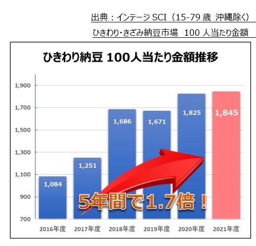 全国15歳~79歳の男女53,600人の消費者から継続的に収集している日々の買い物データを示すインテージSCI(15-79歳)(全国消費者パネル調査)による「ひきわり納豆 100人当たり金額推移」では、2016年度の1,084円から2021年は1,845円と、5年間で1.7倍にも増加していることが示されており、ここからも「ひきわり納豆」の人気が年々上昇傾向であることがうかがえます。