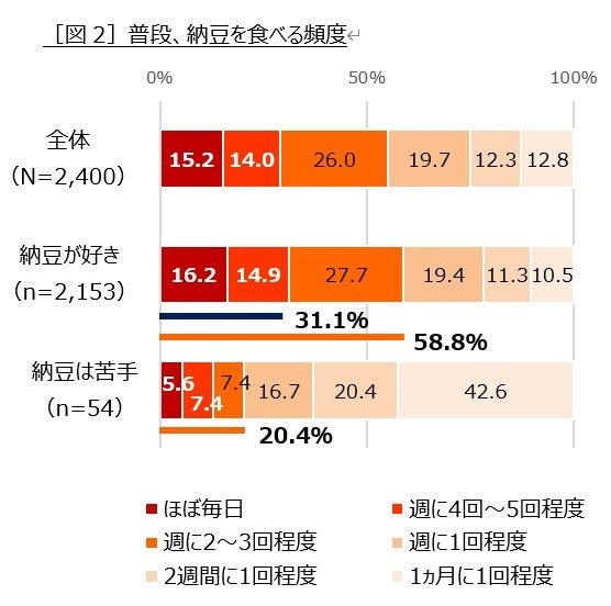 一方、「納豆は苦手」な人でも20.4%(「ほぼ毎日」「週に4~5回程度」「週に2~3回程度」の合計)と約2割は週に2回以上納豆を食べていることがわかりました[図2]。