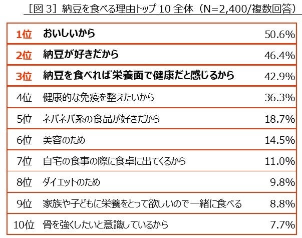 納豆を食べる理由では、1位は「おいしいから」(50.6%)、2位「納豆が好きだから」(46.4%)が多く、味を評価する人が多いことがわかります。