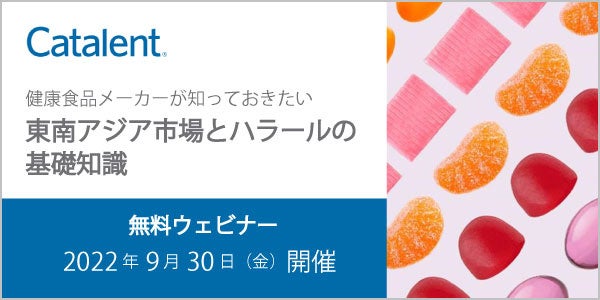 コンシューマー・ヘルス業界におけるソフトカプセル技術のイノベーターであるキャタレント・ジャパン株式会社(本社:東京都港区、代表取締役社長:松村 忠浩、以下「当社」)は、健康食品メーカー向けウェビナー『健康食品メーカーが知っておきたい東南アジア市場とハラールの基礎知識』を2022年9月30日(金)に開催することをお知らせいたします。