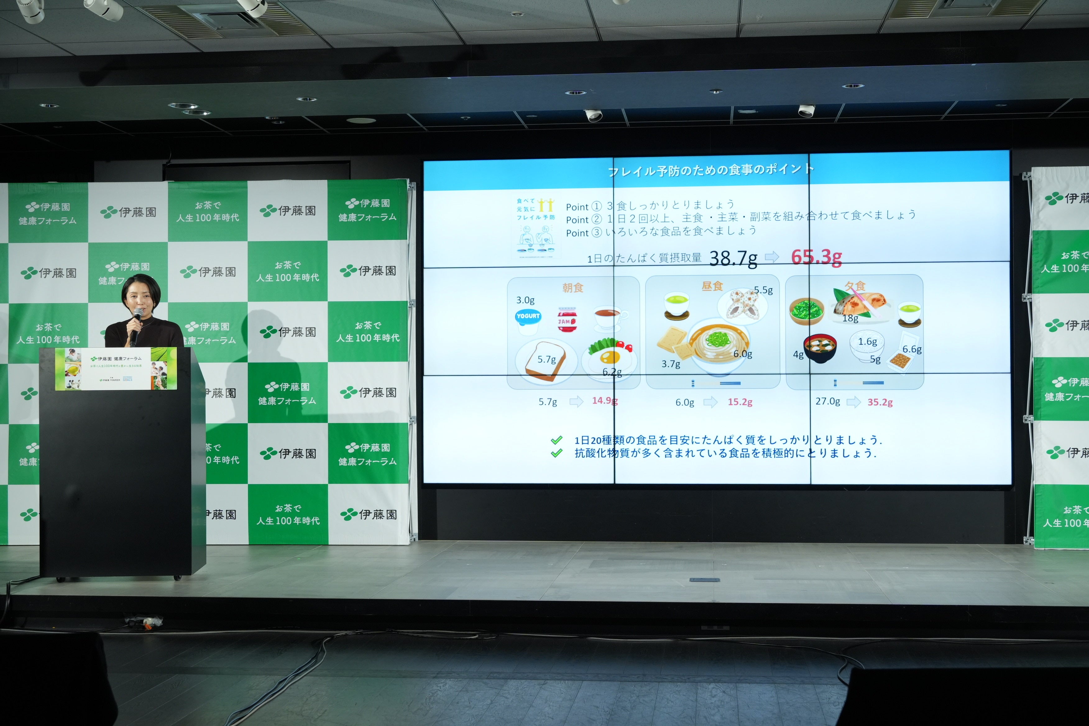 栄養的観点では、たんぱく質を十分に摂ること、そして抗酸化物質の多く含まれる食材を摂ることが大切。たんぱく質は、片手の手のひらサイズの量を目安として食べていただきたい。これによって、1日に十分なたんぱく質が摂れるようになる。また、緑茶を飲む習慣がある方は、フレイルの該当割合が低くなる、という結果が出ており、緑茶に含まれる抗酸化物質が良い結果をもたらしていると推測される。抗酸化物質の効果に加えて、緑茶を飲むような機会でコミュニケーションをとること、すなわち社会参加の部分で影響をもたらしている可能性もあるのではないか。