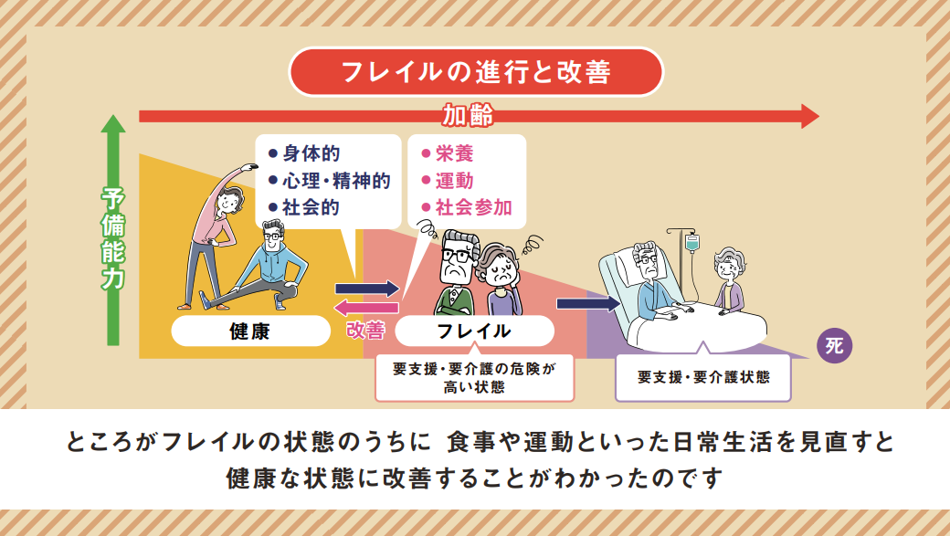 「フレイル」とは、筋力、活力の低下を意味しており、フレイルを放っておくと要介護状態に陥る危険性があります。さらに、高血圧、糖尿病、認知症などの様々な慢性疾患のリスクと関連することも指摘されています。フレイルは、「身体的」「心理・精神的」「社会的」の3つに分類されており、これまでは加齢によってフレイルから要介護の状態に進むものとされてきましたが、フレイルの状態の時に、食事や運動などの習慣を見直すことで、健康な状態に改善することが明らかになってきています。