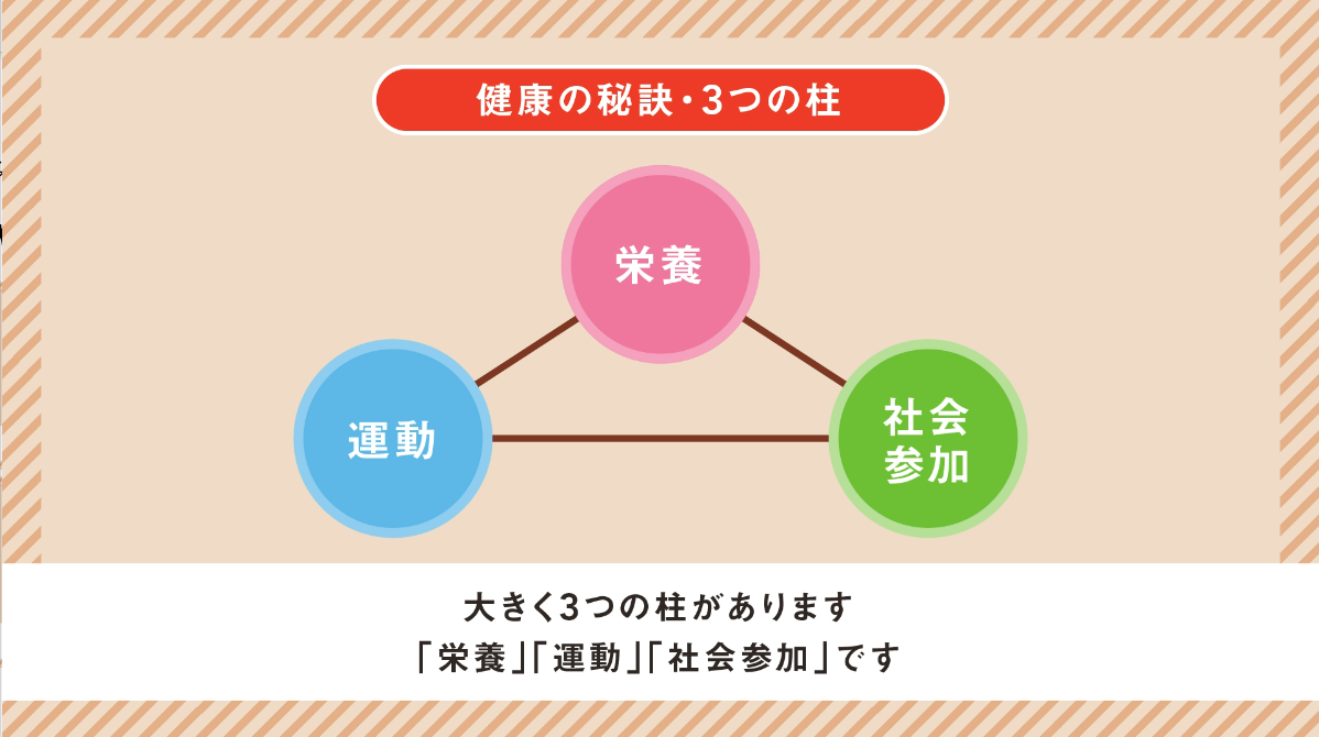 若いときから対策を始めることが重要であり、大きく「栄養」「運動」「社会参加」の3つを意識することが重要です。「栄養」については、健康長寿を考えたとき、年齢が進むと「メタボ」から「フレイル」に対策が変わると考えられがちでしたが、一緒に行うことが重要であり、バランスの取れた食事が大切です。「栄養」と「運動」の関連については、十分なタンパク質や抗酸化物質を摂ることと、適度な運動を組み合わせることが重要です。「社会参加」については、フレイルの人は、外出が少ない、人との交流が少ないということが明らかになっているため、若いときから積極的に社会との関わりを持つことが大事です。