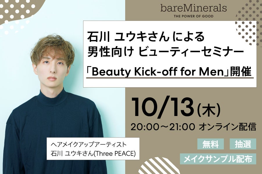 この度ベアミネラルが開催する「Beauty Kick-off for Men」は、「メンズメイクを始めてみたい」「もう1ステップ先のメイクを学びたい」という男性に向けたオンライン ビューティー セミナーです。本セミナーでは、参加者の方に事前にスキンケア・メイクアイテムを送付。それらを実際に使用しながら、実践形式でメンズメイクの基礎を学ぶことができます。