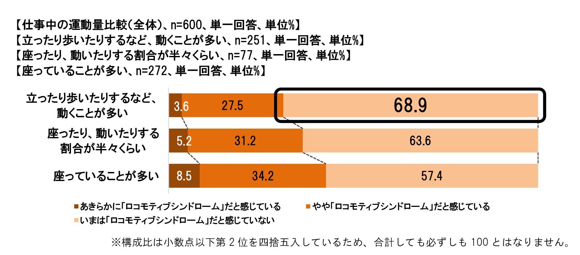 また、「仕事中の運動量」と比較したところ、「立ったり歩いたりするなど、動くことが多い」方は、「いまは『ロコモティブシンドローム』だと感じていない」と回答した割合が最も多く、仕事中の運動量とロコモティブシンドロームとの関連性がうかがえる結果になりました。
