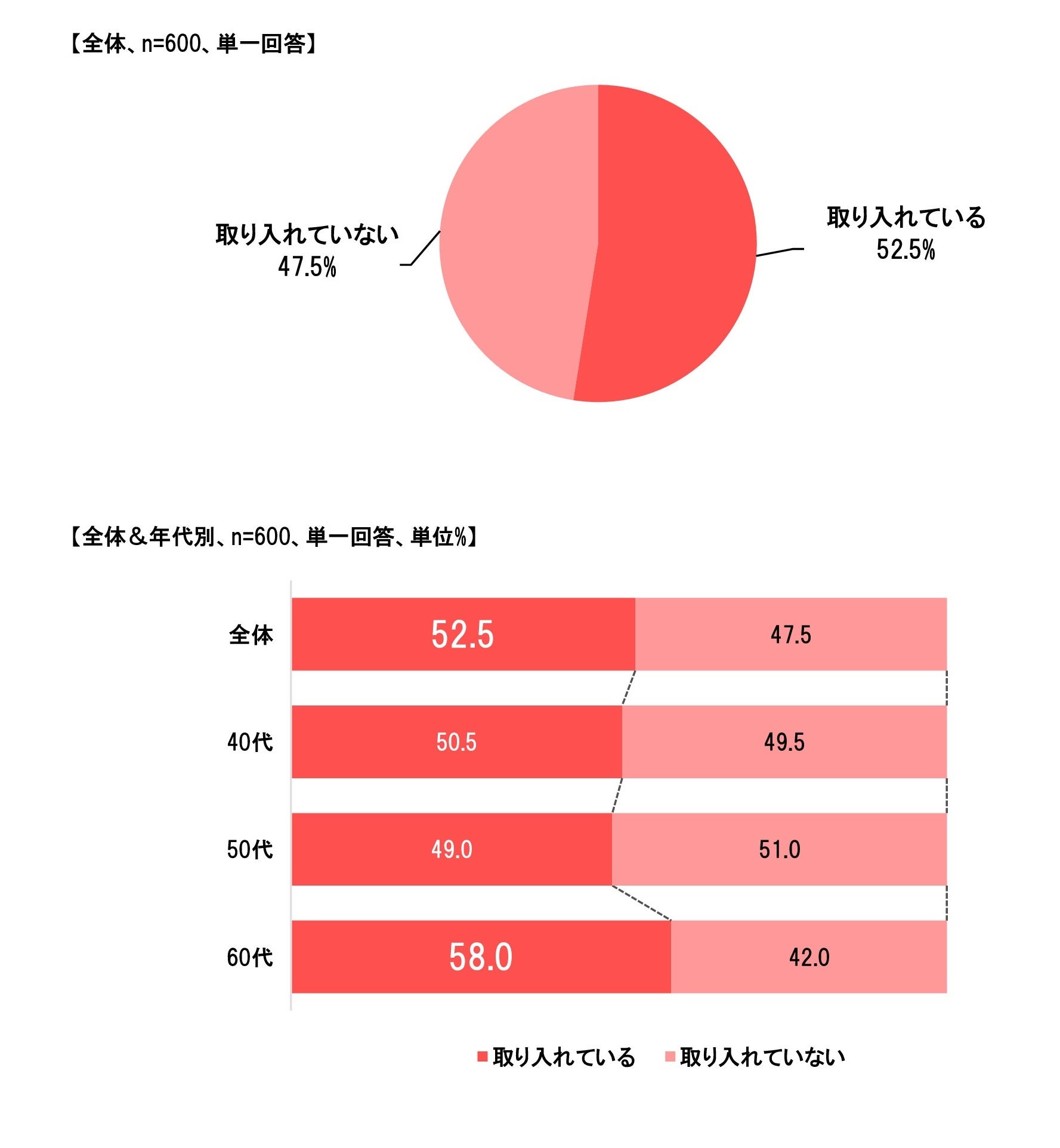 年代別では、60代で取り入れている割合が平均を超える58.0%となりました。