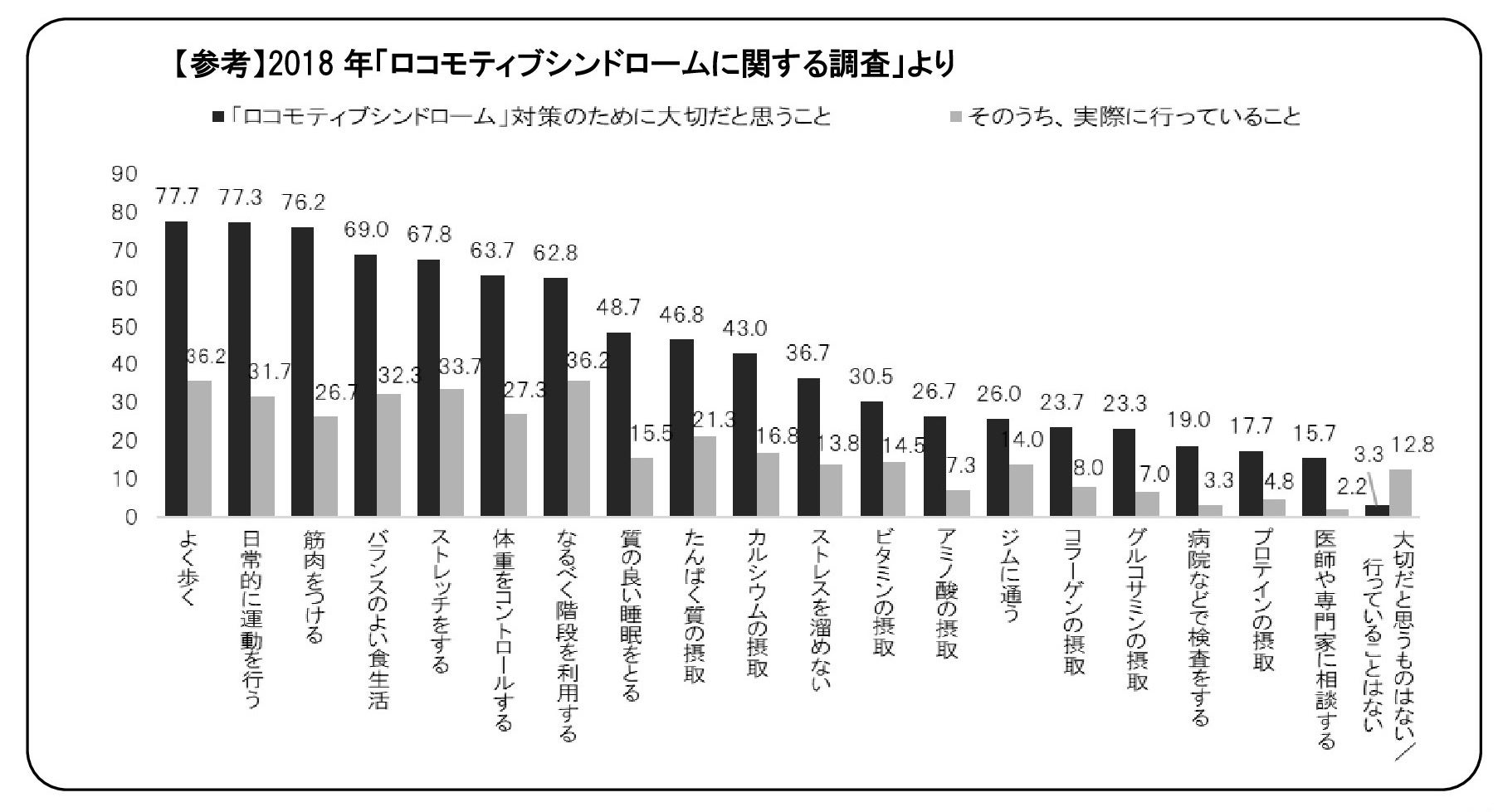 また、「大切だと思うこと」と、「実際に行っていること」とのポイント差に注目すると、2018年の調査と比べ、「日常的に運動を行う」が8.3ポイント、「よく歩く」が9.5ポイント、それぞれ差が縮まり、理想と現実のギャップが縮小する結果になりました。