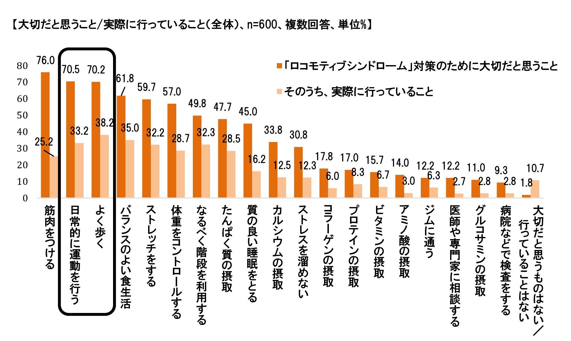 「『ロコモティブシンドローム』対策のために大切だと思うこと、また実際に行っていることを教えてください」と質問したところ、最も大切だと思うことは「筋肉をつける」(76.0%)、次いで「日常的に運動を行う」(70.5%)、「よく歩く」(70.2%)と運動に関する回答が続きました。