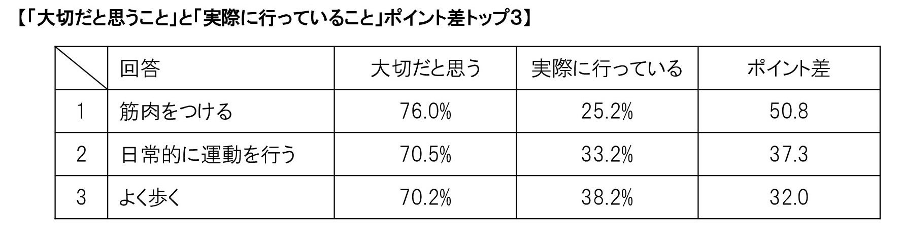 「大切だと思うこと」と「実際に行っていること」のポイント差のトップ3は、「筋肉をつける」(50.8ポイント差)、「日常的に運動を行う」(37.3ポイント差)、「よく歩く」(32.0ポイント差)となりました。